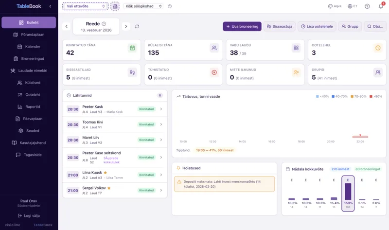 See also: daily plan →Opening the system you see immediately: today's reservations, guest count, available tables, waitlist length, alerts and weekly summary. Open reservation details with a single click — guest info, special requests, status changes.